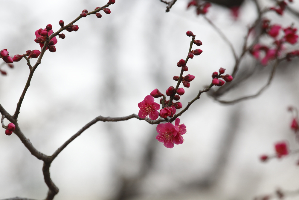 関東地方ではすでに見ごろを向かえた梅の花。季節の花として人気の被写体です。色あい、花と枝のバランス、背景など撮影がとても難しい被写体であることは以前述べたとおりです。今回は光が強く当たらない曇りや雨のライティングでの梅の撮影を行ってみました。