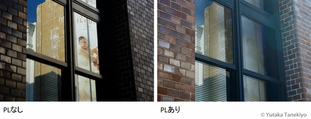 まず、ガラスの反射に見えるPLフィルターの効果の違いです。これは水面の反射でも同じような効果が表れます。右の画像がPLあり、左がなしです。