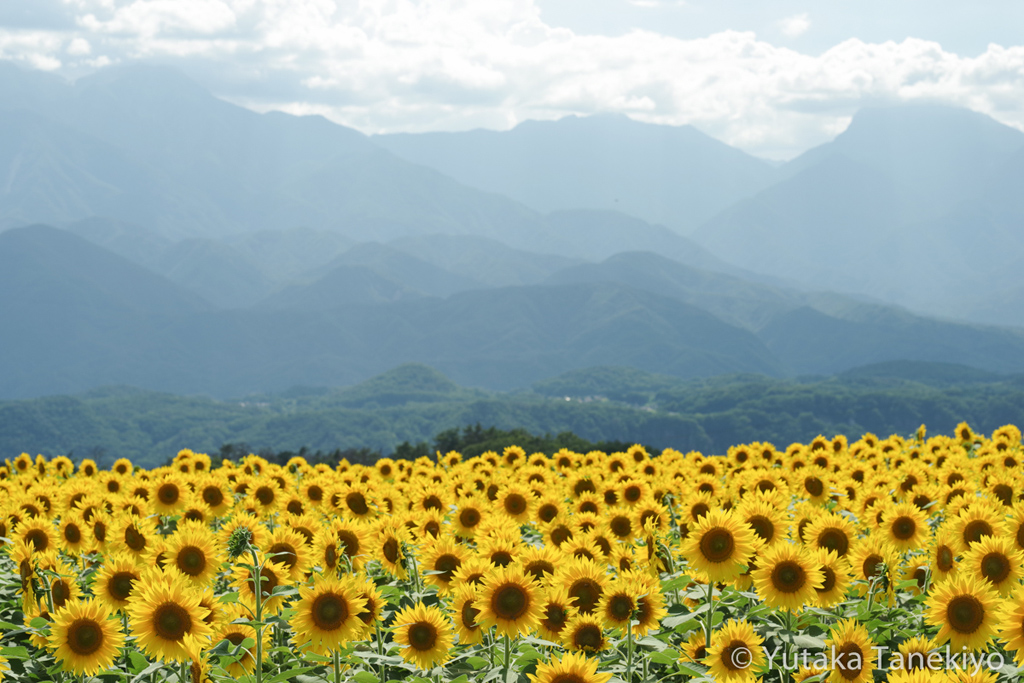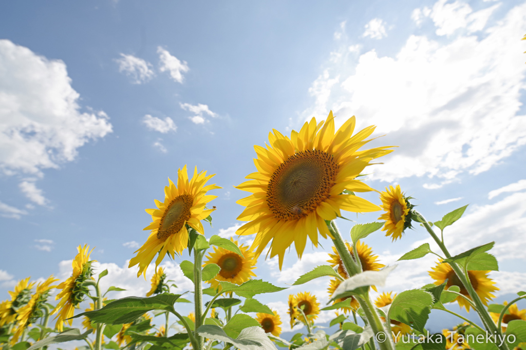 ヒマワリは太陽の方向に向かって花が方向を変えるといわれますが、それは生長途中の若いヒマワリの特徴のようで、花がしっかりと開いて満開に生長したほとんどは東側を向いたままになるようです。ですので、午後になるとヒマワリの正面に対して太陽は逆光になると考えられます。作例写真は山梨県「北杜市明野サンフラワーフェス」でのヒマワリ畑を撮影したものです。時間は午後2時ごろから3時ごろ、太陽はまだ高いですが、やはり逆光での撮影になりました。逆光の場合は、プラス側の露出補正で対応したり、また逆光の広い景色を狙う際はHDR機能を使用して輝度差を軽減して撮影してみてもいいでしょう。