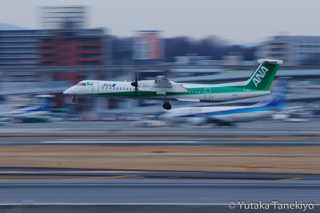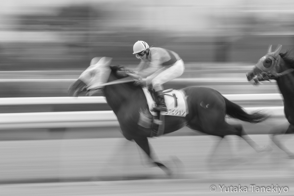 流し撮りで撮影した3枚の作例ですが、新幹線の写真はシャッター速度1/10、手前に少し黄色い葉っぱを入れて前ボケ部分も流しています。飛行機の写真は夕暮れ時に1/30で撮影したものです。窓枠や文字なども比較的止まって写りました。最後の競馬の写真は1/15で撮影。直線で競争馬や騎手も動きがあり被写体ブレが目立ちますが、騎手のヘルメットはしっかり止まり、また背景に見える白い内ラチは上下にぶれることなくキレイに横方向に流れてくれました。