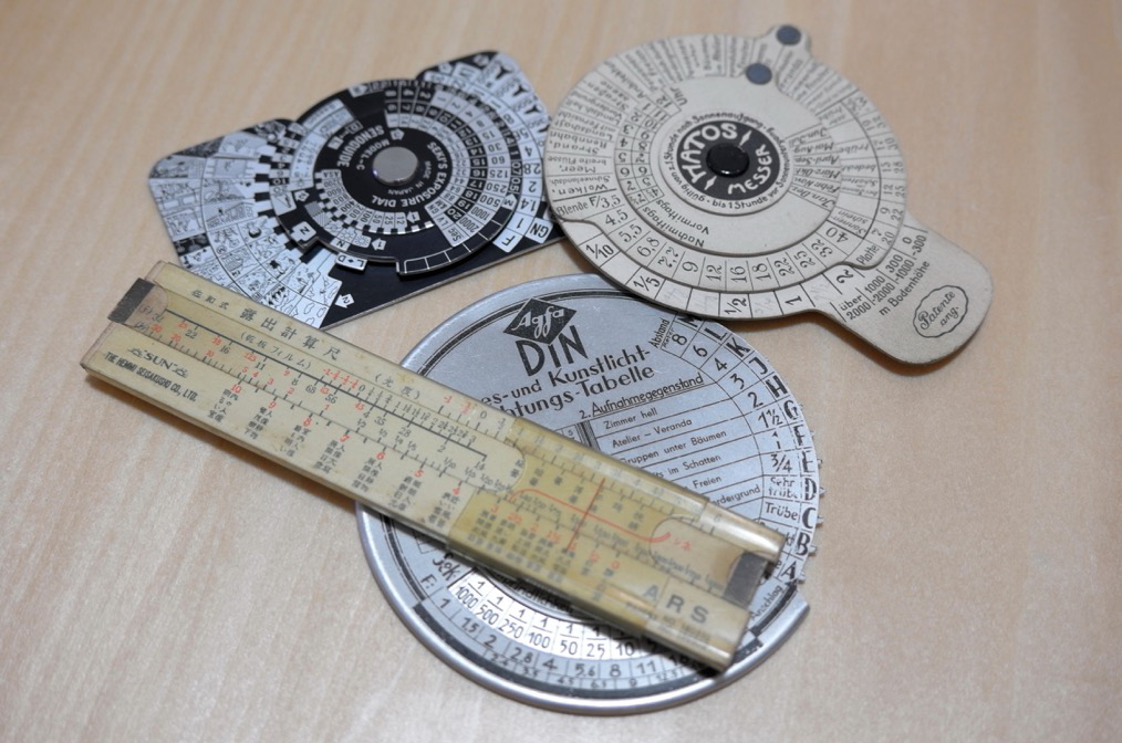 19世紀後半に完成したもっとも初期の頃の露出計は、紙や木、金属板などでできていて、そこに印字された露出決定に関するファクターを当てはめて行きながら露出を求めるカリキュレーターのようなものでした。露出決定に関するファクターとして例えば、撮影時の季節、時間帯、天候、そして被写体の種類や置かれた状況(室内、屋外、反射の有無、遠い景色、近い景色、建物など)などが挙げられます。そこに加えて、感光材料の種類やフィルター係数を露出計に設けられた目盛りに当てはめていき、必要な露光量を導きだします。このカリキュレータータイプの露出計は電気式のものに比べ格段に安価で手軽に手に入ることから時代ごとに改良を重ねながら、戦後に至っても広く使われました。