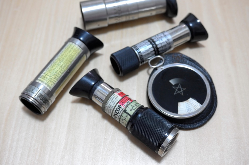 また、直接被写体に当たる光量を読み取る、光学くさびを利用した露出計(ダークスクリーン式と呼ばれたりします)も普及します。形状は小型の望遠鏡のようなもので、露出の求め方はまず、露出計を被写体に向けて覗きます。そしてそこに現れる数字もしくは被写体が視認できるギリギリの暗さになるところまで筒を回転させる、もしくはもっとも暗く表示されている数字を読み取り、筒の表面に印字された露出表に照らし合わせて絞りやシャッター速度を求めるというものです。慣れは必要ですが、屋外はもとより薄暗い室内などでも計測することも可能です。