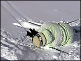 さて、撮影舞台をゲレンデに移しましょう。ここでは、格好良くすべるベテランスキーヤーがいっぱい。フォト美もそういう人たちの滑りを間近にしたせいか、自分でもさらに(?)上手くなったような気がします(あ、右の写真は たまたま転んだ不運な私デス・・・)。そこで、ぜひとも自分の滑りを写真に撮ってもらいたいのですが、何たって速いスピードで滑っていく人をデジタルカメラでタイミング良く写すというのはムズカシイもの。一緒に滑っている仲間にカメラを預けても、やはり躊躇されちゃいました。そんなときは、次のような方法で撮影してもらうと良いでしょう。 |