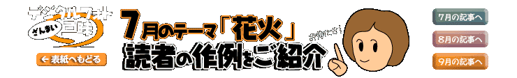 ここでは、2001年7月1日〜8月31日に読者の方々からお送りいただいた作品の中から「フォト美賞」に輝いた作品を、7月のテーマ「花火」の作例として掲載しています。