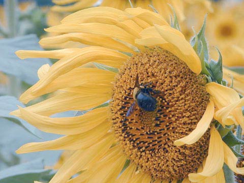 ●コメント 「ひまわり畑を飛び回っていた大きな蜂。ずんぐりしたお尻がなんともユーモラスでした」