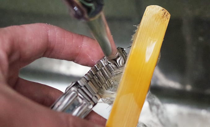 メタルバンドやケースは超音波洗浄機で汚れを飛ばし、柔らかいブラシ隅の汚れもキレイに取り除きます。洗浄機を通したあと水分が残らないように乾燥させます。