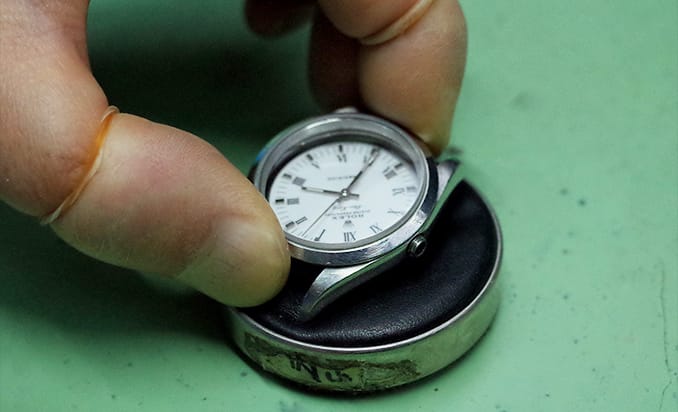 防水機能のある時計は、組み上げ後に防水試験機を使用して防水性能が機能しているかチェックを行います。ベルトやリューズの状態や各機能が正常に動作するか最終チェックをしたのち完了となります。
