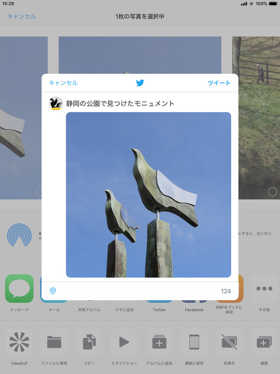 読み込んだ写真で気にいったものがあればすぐシェアできるのも魅力だ。セルラーモデルのiPadならばWi-FiがなくてもOK。例えばツイートしたいならば、写真を選択してシェアボタンからTwitterを選び、テキストを入力してツイートするだけ。デジタルカメラの高画質をすぐシェアできる。もちろんFacebookに投稿するのも同様だ。