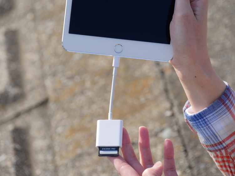 iPadには「Lightning – SDカードカメラリーダー」を使って撮影データを読み込む。