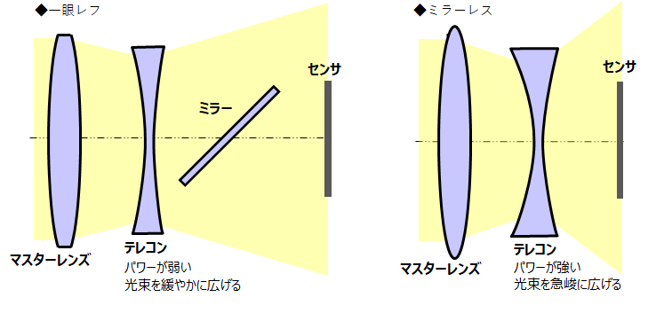 テレコンは同じ倍率であれば光を曲げるパワー(屈折力)が強くなるほど、製品全長を短くすることができます。一眼レフの場合、マウントからセンサまでの距離が長く、比較的弱いパワーで緩やかに光線を拡大させるため、製品全長は長くなりがちです。