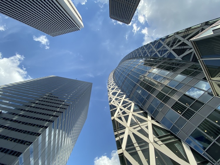 ■新宿副都心のビル群を超広角カメラで見上げてみた。高層ビルをドーンと迫力満点に捉えられた。画面上の「0.5x」というアイコンをタップすれば誰でもカンタンに撮影できるのがうれしい