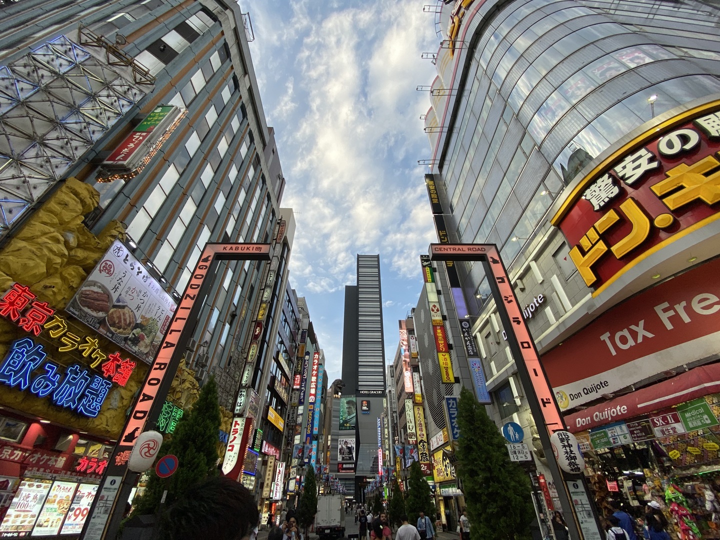 ■同じく超広角カメラで新宿・歌舞伎町の入り口から中心部を狙ってみた。ビルの直線は真っ直ぐと描かれ、大胆なパースとともにウルトラワイドの世界を堪能できた。発色はやや派手めでコッテリとした印象を受ける