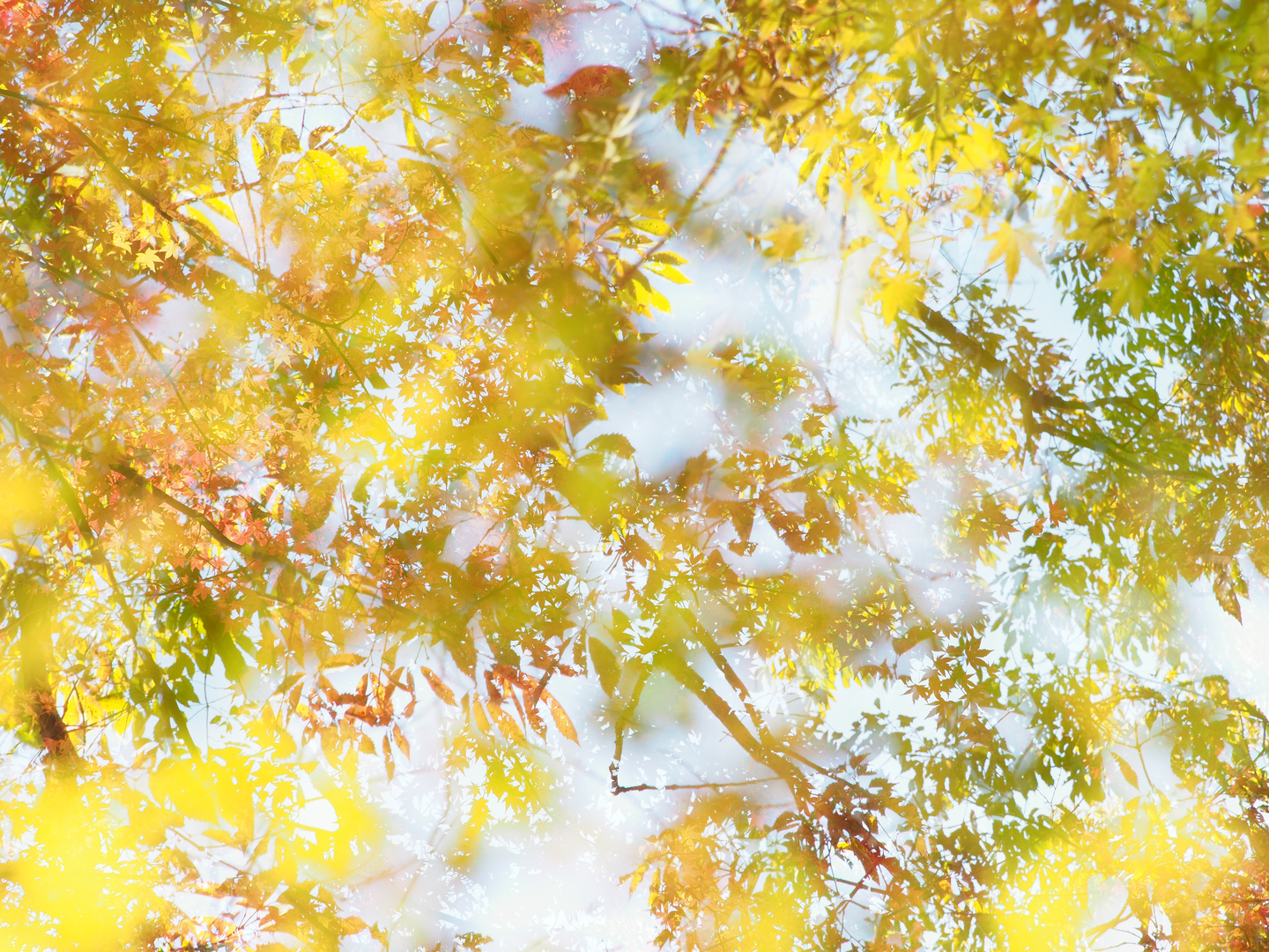 この作品は多重露光で紅葉を幻想的に表現しました。(1枚目と2枚目をピント位置を変えたり、影絵になるように位置調整して撮影しました)