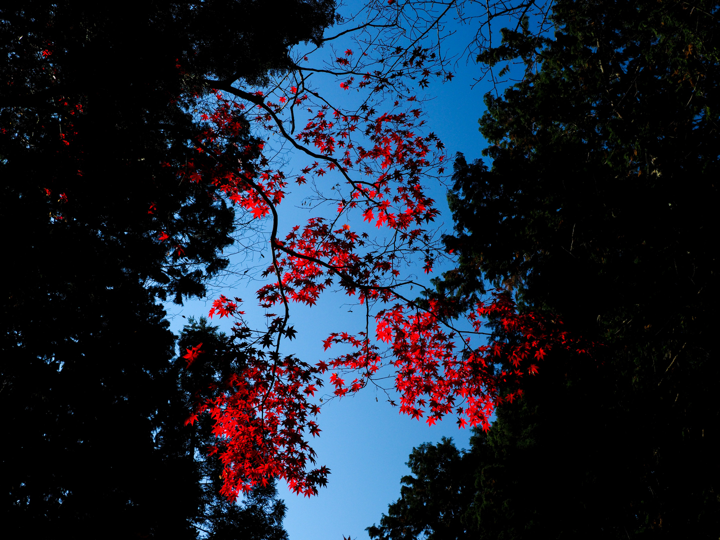 部分的に光が当たる紅葉を見つけたら明暗差でこのような表現にもできます。