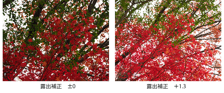 また、このようにカメラを真上に向けたり、背景に太陽や白い空などを撮影する場合、時として逆光になってしまいがちで被写体に色が出ず、暗く(黒く)なりますのでその場合、露出補正±を+(明るく)にすることが多いです。