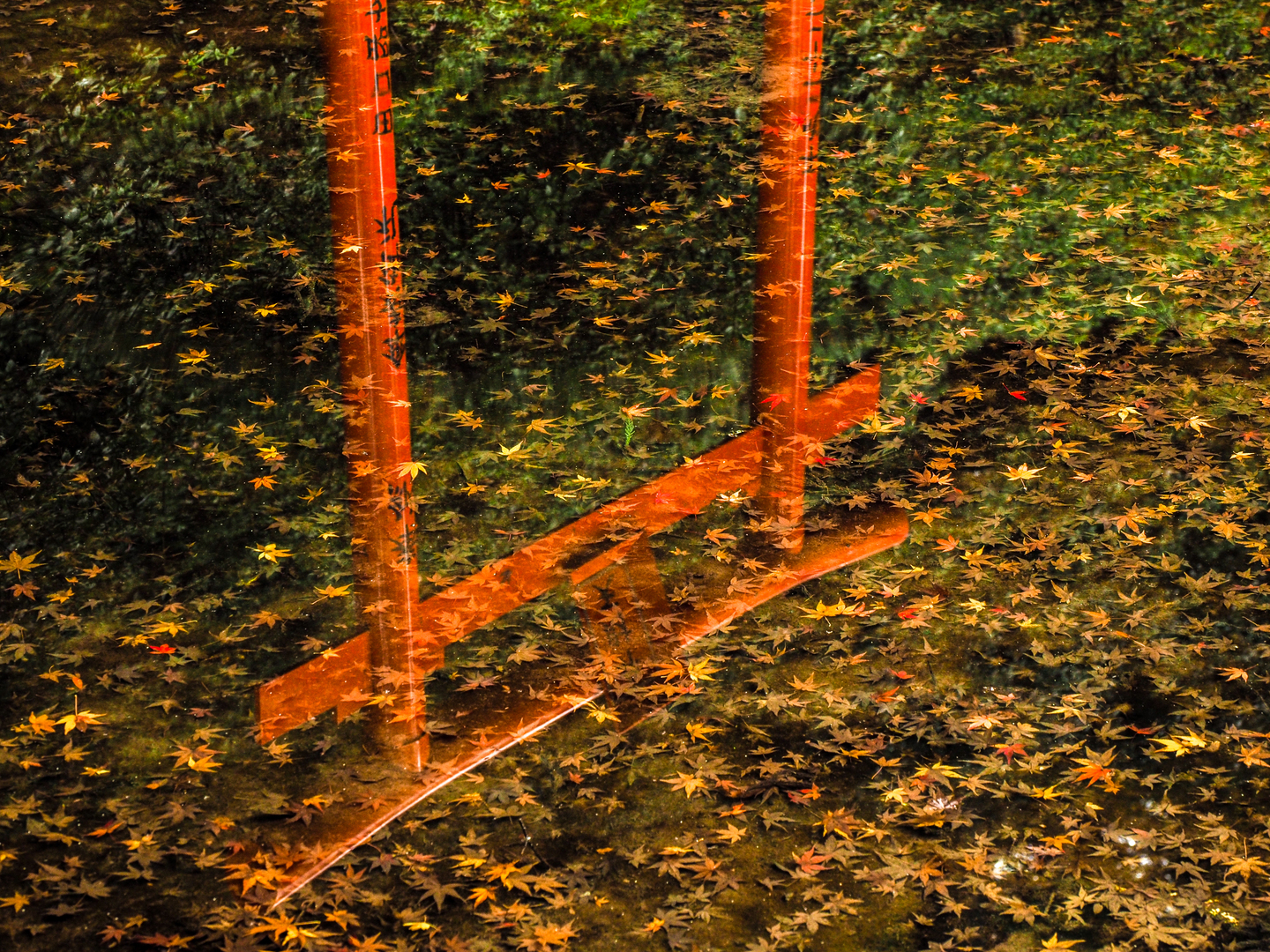 PLフィルター効果で使用した作例(反射1/3無し)で鳥居の反射を入れつつ、水中の紅葉を模様のように表現しました