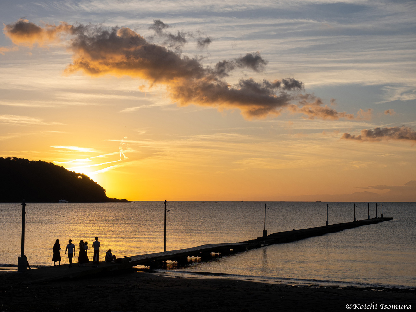 南房総市富浦町は東京湾に面した小さな町でが、水平線に沈む夕日は房総半島のなかでも有数の美しさです。海岸には木造とコンクリート造りが組み合わされた岡本桟橋が設けられており、近年ドラマや映画、CMの撮影地として取り上げられたことでとても人気となり、多くの人々が集まり思い思いに写真撮影を楽しんでいます。現在は台風15号の影響で桟橋は立ち入りが制限されていますが、海へと伸びる桟橋の姿は変わらずとても印象的です。
