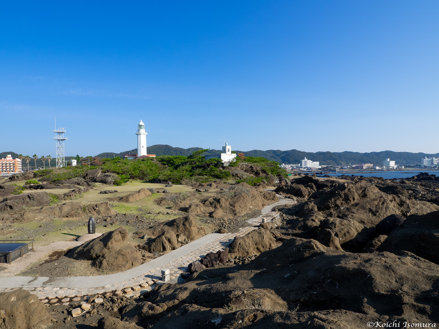 房総半島最南端に位置する野島崎公園は、陸と繋がった小島のような岬です。公園内には自然の岩場がそのまま残り、野趣あふれる姿が楽しめます。岬に建つ野島崎灯台は、洋式灯台としては日本で二番目に古い灯台ですが、白色八角形の姿は青空に映えるとても美しい灯台です。日本の灯台50選にも選ばれており、展望台から望む太平洋はとても雄大です。公園内には飲食店や土産店もあり房総の幸を求めることができます。