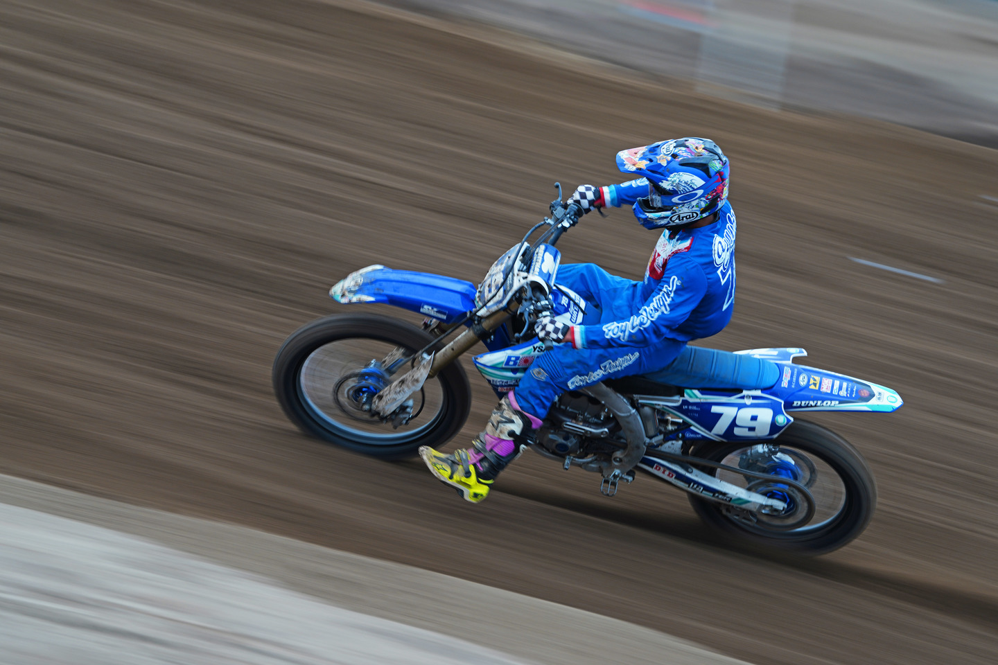 バイク のレースの中でもモトクロスバイクのレースの 流し撮りは 難しいカテゴリーです。舗装されたサーキットを走るロードレースの場合は、バイクが上下にぶれことは少なく流し撮りを比較的撮りやすいのですが、モトクロスのコースは未舗装の悪路でバイクも激しく上下にも動くので、被写体のブレが大きくなり流し撮りの難易度は飛躍的に上がります。
