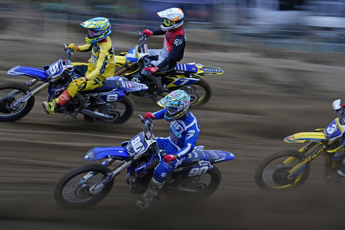 スタート直後の集団の流し撮りは、それぞれのマシンのスピードが違うためにマシンのブレ具合もまちまちになって、スピード感の変化が楽しめる作品になります。上の写真であれば、フロントタイヤのブロックパターンの見え方がそれぞれ違い、スピードの違いも表現することができています。