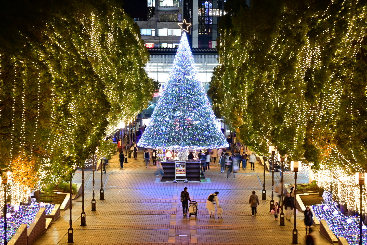 輝くツリーを真正面から捉えました。NIKKOR Z DX 16-50mm f/3.5-6.3 VRで37mm相当の画角です。三脚を使って1/2秒というスローシャッターを切って歩いている人物をブラして撮りました