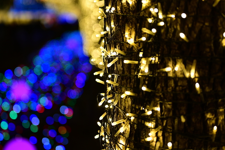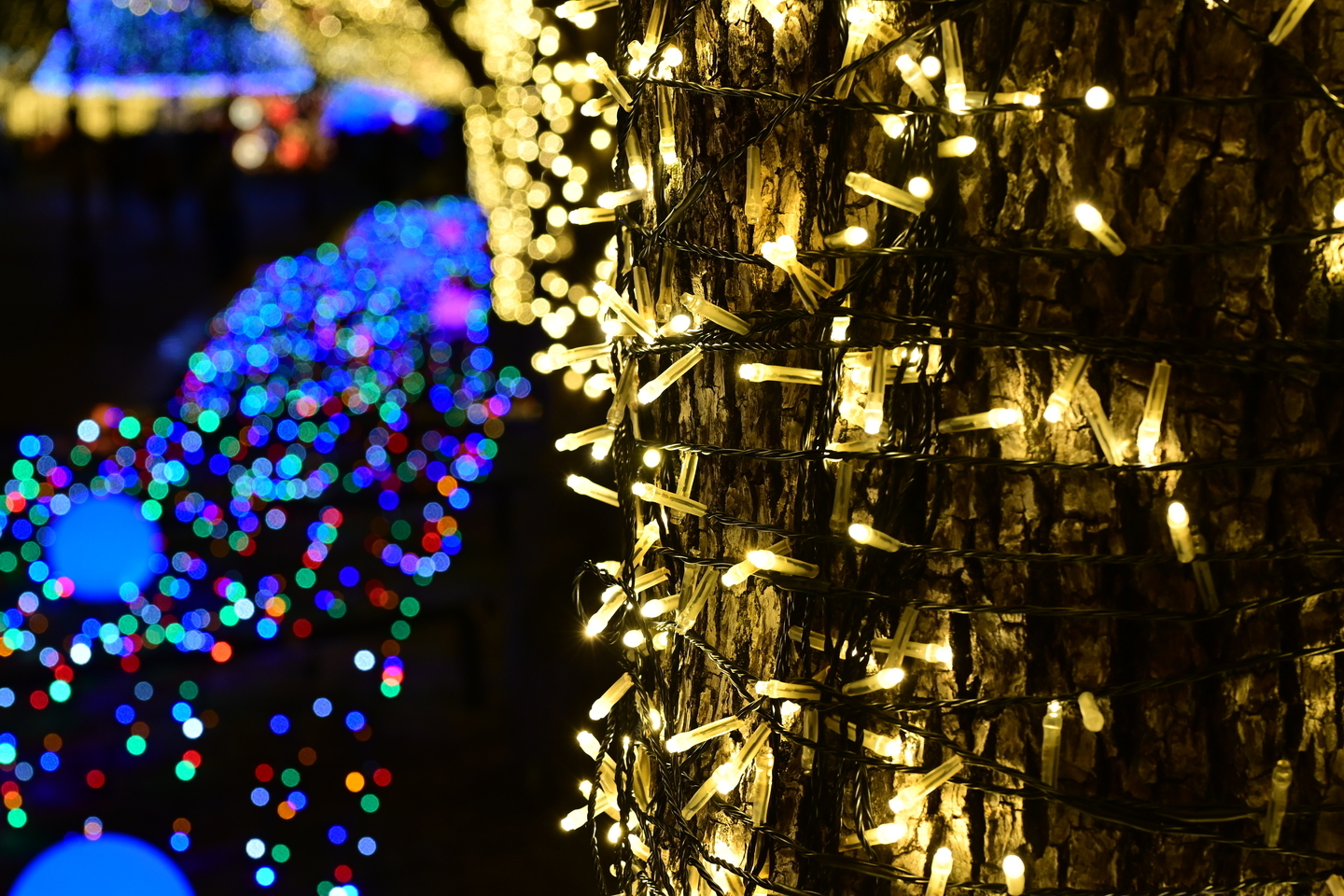 先ほどは絞りF1.8開放でしたが、今度はF5.6に絞ってシャッターを切りました。背景に見えるLEDの玉ボケが小さく写っていますが、絞ったためシャープで小粒な様子に撮れています。立木のイルミネーションもピントが深くなってより精細に写っていることがわかるでしょう。