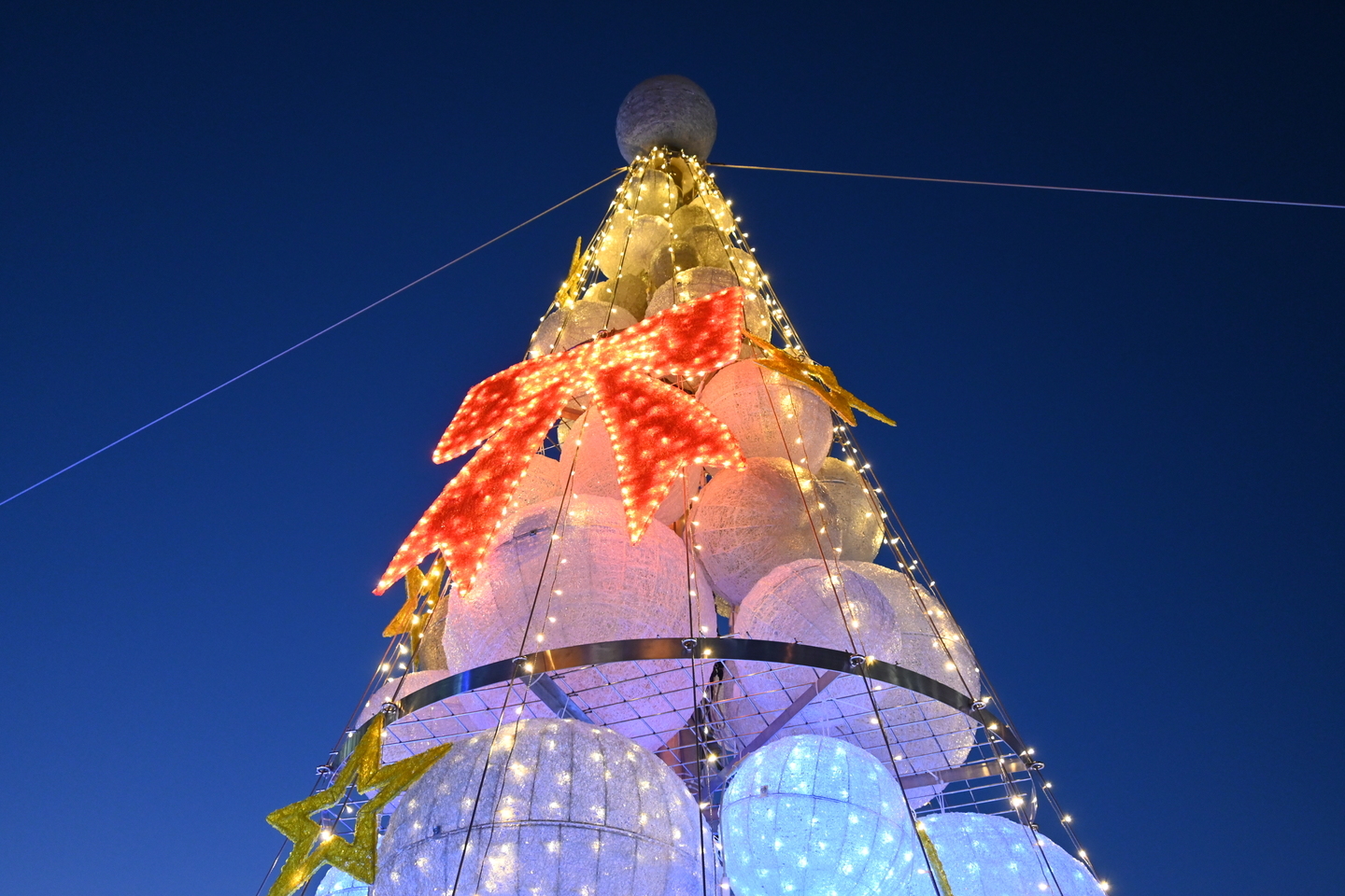次は同じツリーを見下ろせる高台に移動しました。レンズは望遠ズームレンズのNIKKOR Z DX 50-250mm f/4.5-6.3 VRにチェンジ。望遠の圧縮感が出て雰囲気がかなり変化した写真になりました。地面に左右のイルミネーションが反射して美しく光っていますね。このようにズーム位置、アングルを変えると見え方がガラリと変わるので、自分なりの撮影ポイントを見つけると楽しくなりますよ