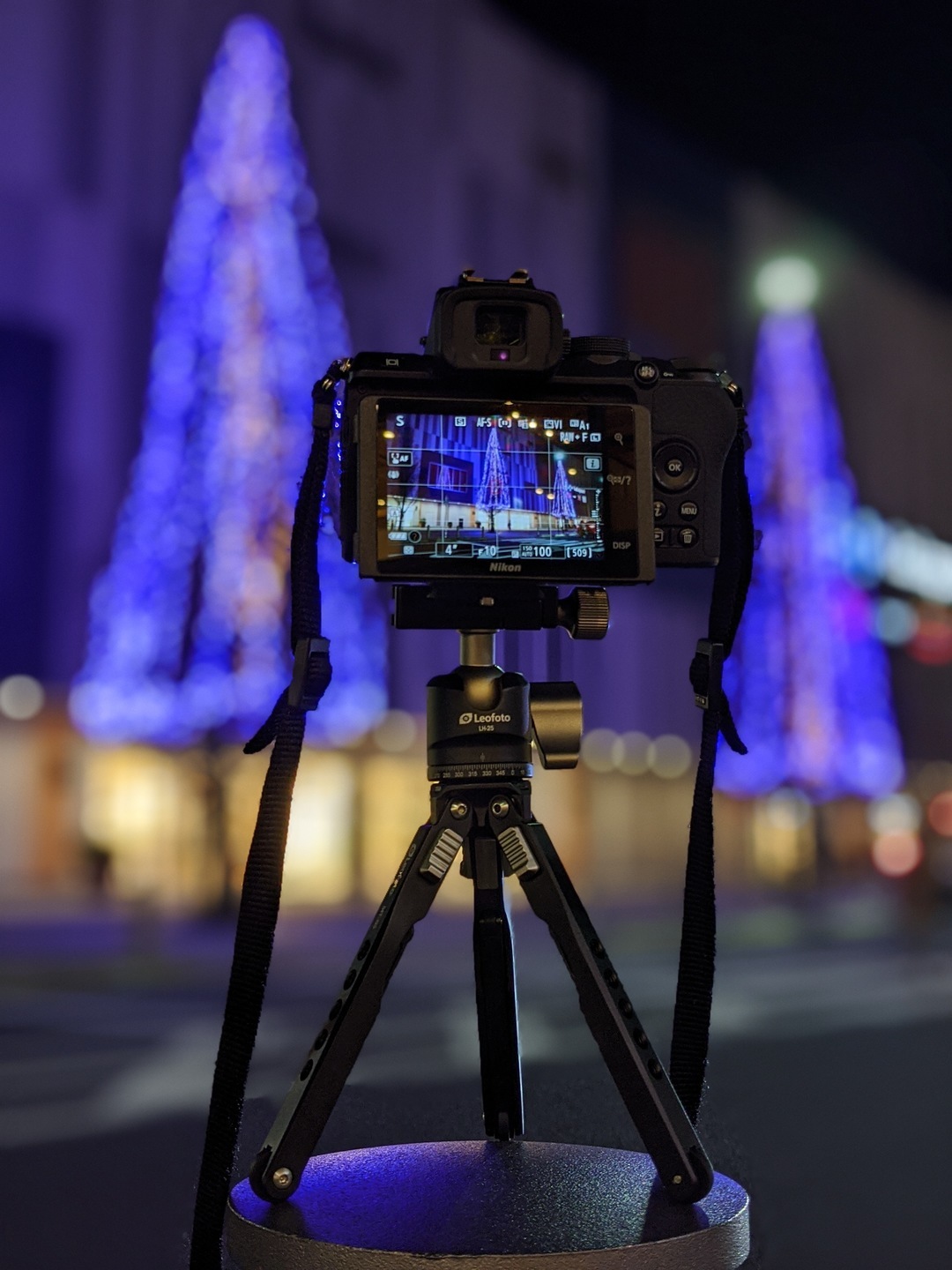 レンズ交換ができるデジタル一眼レフやミラーレス一眼カメラがいいでしょう。理由は、レンズを交換してさまざまな画角でイルミネーション撮影を楽しめるからです。最近発売された機種は高感度にも強く、夜景を撮るのにオススメです。今回はニコンのAPS-Cミラーレス一眼「ニコン Z 50」を使用しました。軽量コンパクトなだけでなく画質にも優れ、初心者から上級者まで納得して使える性能を持っています。
