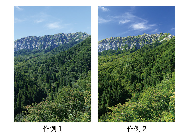 PLをきちんと調整して、最も効果が強い状態で使用すれば(作例2)空気中に浮かぶ水蒸気の反射を抑えることができます。そうすると「青空が最も濃く、雲とのコントラストが強く」なり深い色表現になるという理屈です。同時に山肌の緑色が鮮やかになっています。色々な使い方があるPLフィルターですが、先ず基本として、最も効果の強い箇所を探る事に慣れるのがポイントです。