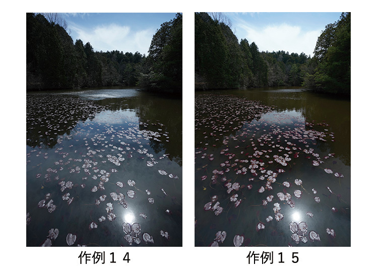 反射を取って色を鮮やかにするのが目的のPLフィルターですが、どんな場合でも効かせればよいというわけではありません。(作例14)は水面への雲の映り込みとスイレンの葉のギラギラ感を表現するため、むしろ最も効果を弱めることで反射を増やして撮影しています。