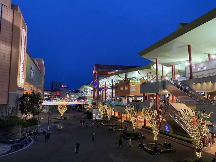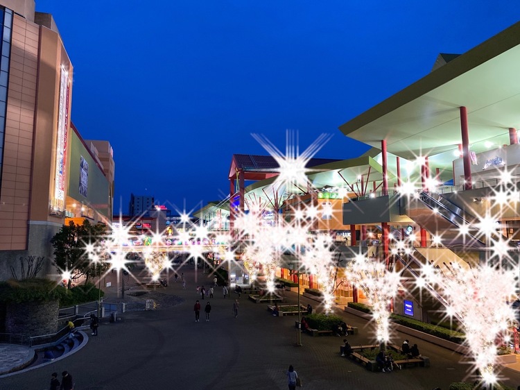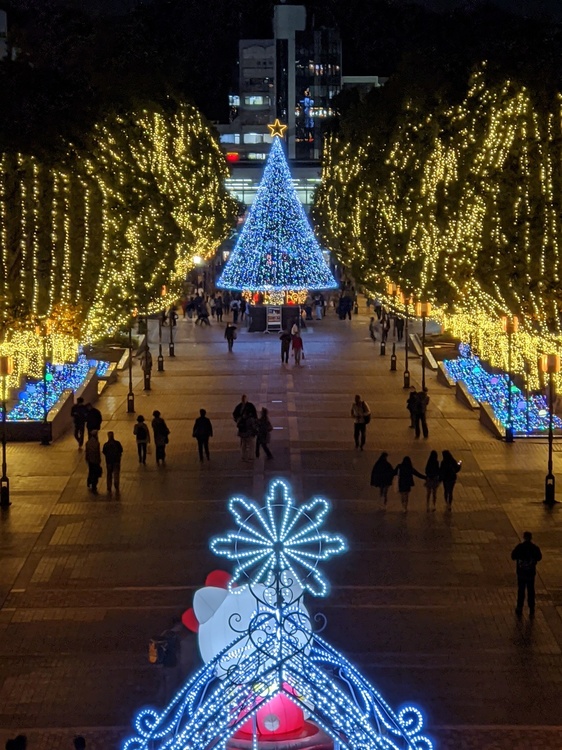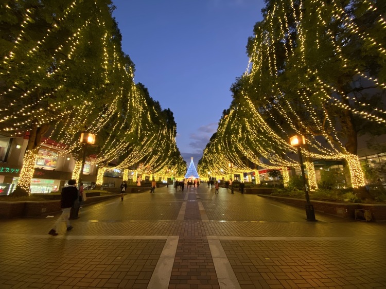 遊歩道の両側に設置されたイルミネーションなどはパノラマ撮影がオススメです。超広角カメラを搭載したiPhone 11シリーズで撮影するのもいいですが、どうしてもイルミネーションが小さく写ってしまい迫力が出ません。