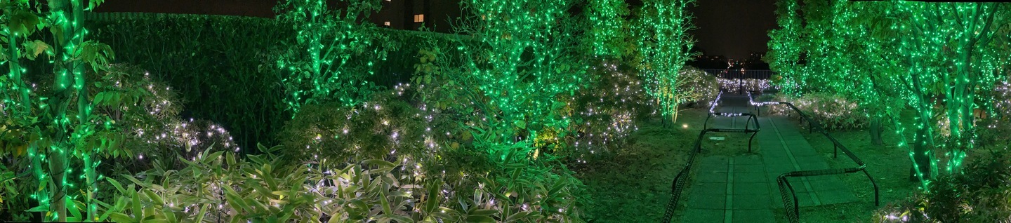 iPhone のパノラマ機能を使用した。イルミネーション内をとおる通路で撮影。狭いところに入って撮ると迫力が出る。動くものがなるべく入らないように撮るのがコツ