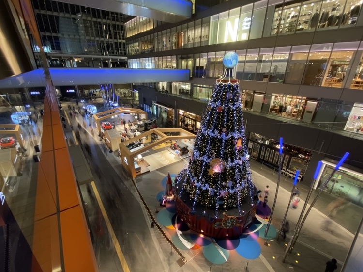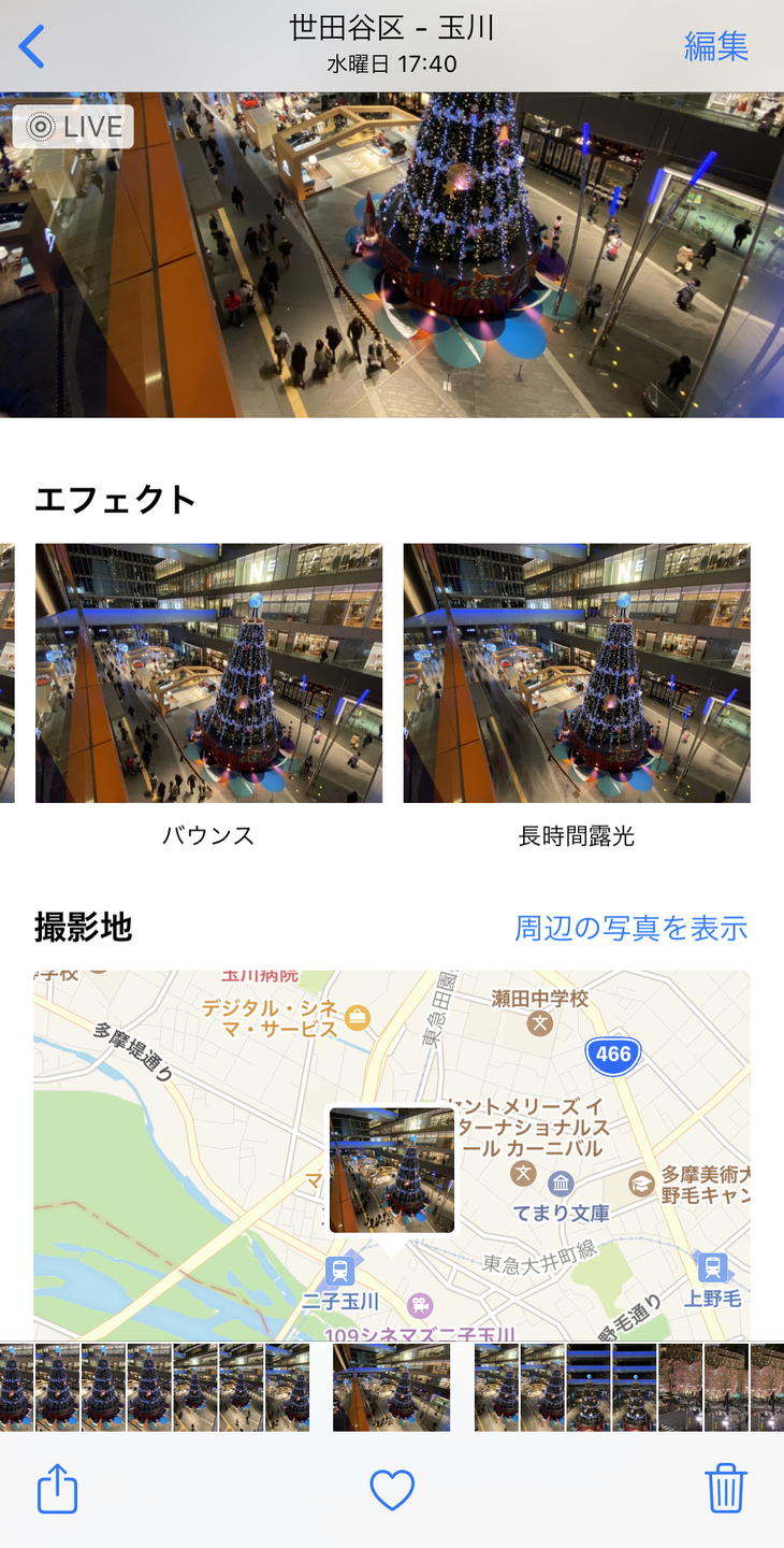 ショッピングセンターのクリスマスツリー。周囲を人が歩いている。これを「Live Photos」で撮影