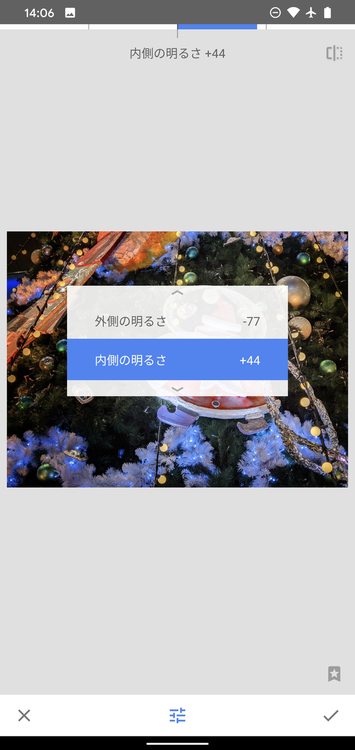 「外側の明るさ」を選んで指を左右に動かすと明るさをコントロールできます。左方向に指を動かしてやや暗めの明るさに設定したあと、今度は「内側の明るさ」を選択して、やや明るめになるように指を右方向にスライドします。