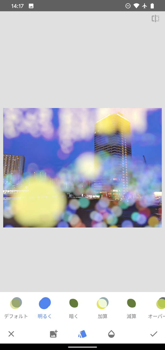 気に入った場所に写真を重ねたら、下部中央のアイコンで「明るく」「加算」などのサブメニューを選択して自分なりの表現をしてみましょう。あとは「エクスポート」すれば二重露出写真の完成です。「Snapseed」は文字入れも可能なので、気に入った作品にメッセージを入力して送ってみるのもオススメです。撮影はもちろん、写真の加工もできので気軽にイルミネーションを楽しめますね。いろいろとトライしてみてくださいね。