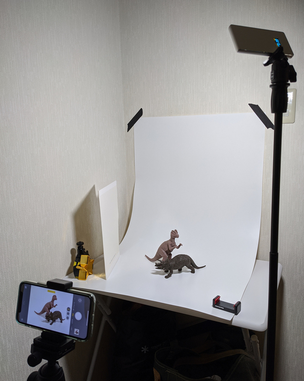まずはブツ撮りをする場所を確保しましょう。前回のデジタルカメラ編と同じく簡易撮影ブースを作ります。撮影する商品の大きさにもよりますが、だいたい1m四方の平らな場所があればいいでしょう。オススメは壁際のスペースです。そこにホームセンターなどで販売されている折り畳み式のテーブルを設置しましょう。代用できる台でも結構です。そして背景となる白い紙を貼りましょう。上端を壁にテープで貼り付けて、テーブル上でカーブさせます。こうすることによってスタジオっぽく仕上がります。今回は前回と方向を変えて撮影場所を確保しました。