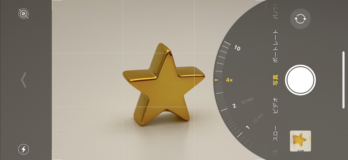 撮影台にブツを、LEDライトをスタンドに、三脚にスマートフォンを据えたらいよいよ撮影です。ここで気をつけたいのが「水平」です。画面が傾いてブツが斜めにならないように構図を決定しましょう。この時に便利なのが「グリッド線」です。お使いのスマートフォンによって表示する方法が異なりますが、iPhoneの場合は「設定→カメラ→グリッド」でディスプレイ上に現れるようになります。