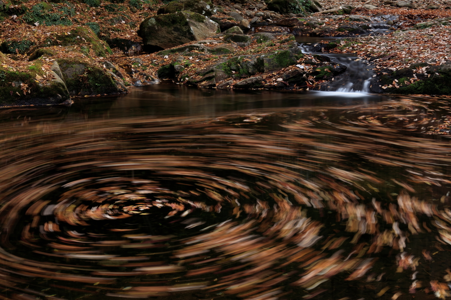 高濃度NDがあれば日中でも超低速シャッターが可能。落ち葉を軌跡として