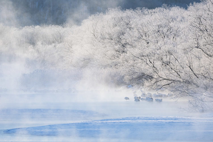 この音羽橋はタンチョウの寝床になっていて、川沿いに広がる霧氷と陽の光の変化が幻想的な風景を演出してくれます。ここでの撮影は日の出前に撮影スタンバイし、日の出とともに刻々と景色が変わっていく様を撮影します。