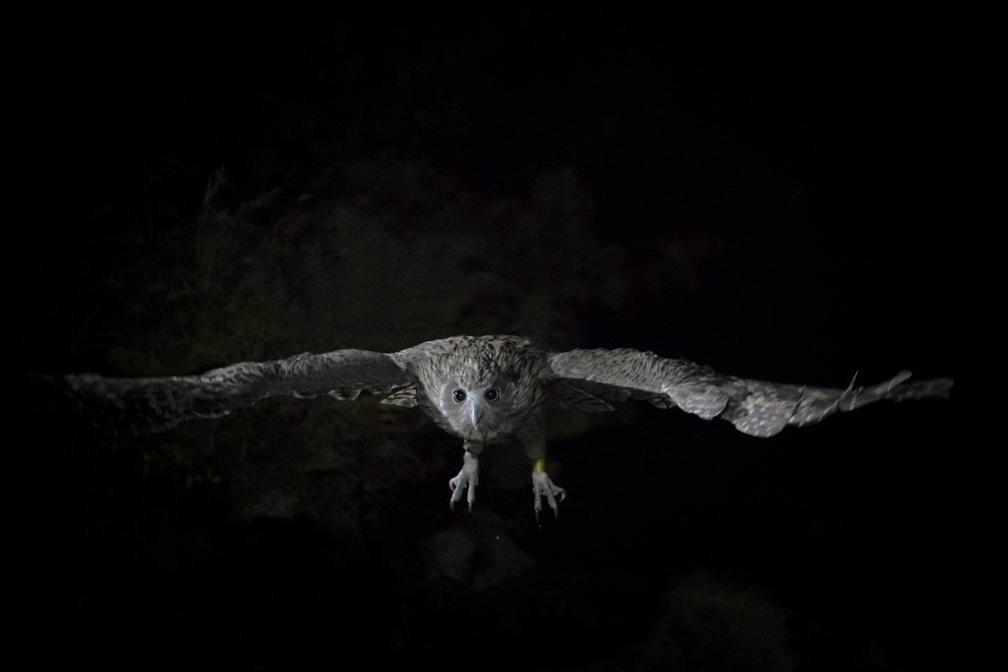 次はさらに北に移動して知床半島の羅臼です。ここでは、夜にシマフクロウが観察できる施設を利用して撮影することができます。観察施設にはシマフクロウに優しく、本格的写真撮影が可能な特別製の照明が設置してあり、暗い中でも撮影することができるようになっています。