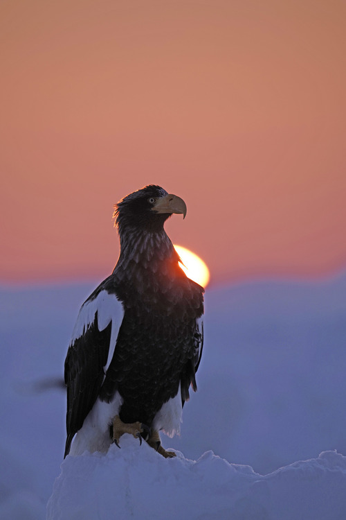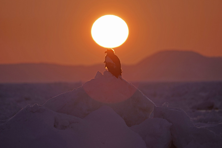 夜の撮影が終わったら、そのまま早朝の撮影に突入です。かなりハードですが、いい写真を撮るには努力も必要です(笑)。羅臼から日の出前の観光船に乗って、流氷のあるポイントへ移動します。太陽が出始めたら撮影開始。オオワシやオジロワシと太陽と流氷のコラボレーションをフレームにおさめましょう。