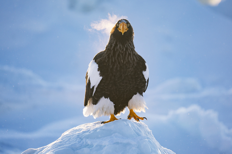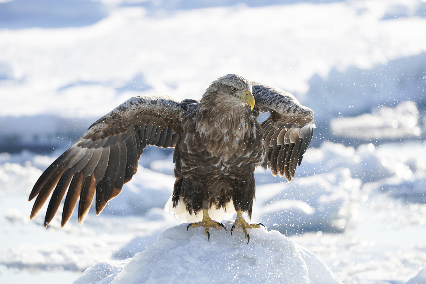 流氷ポイントの船の上での撮影はとても寒くて厳しい環境ですが、それゆえ撮れた写真は特別なものとなります。オオワシの息遣いまでも撮ることができました。