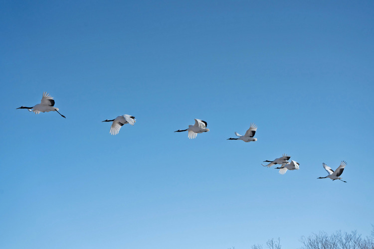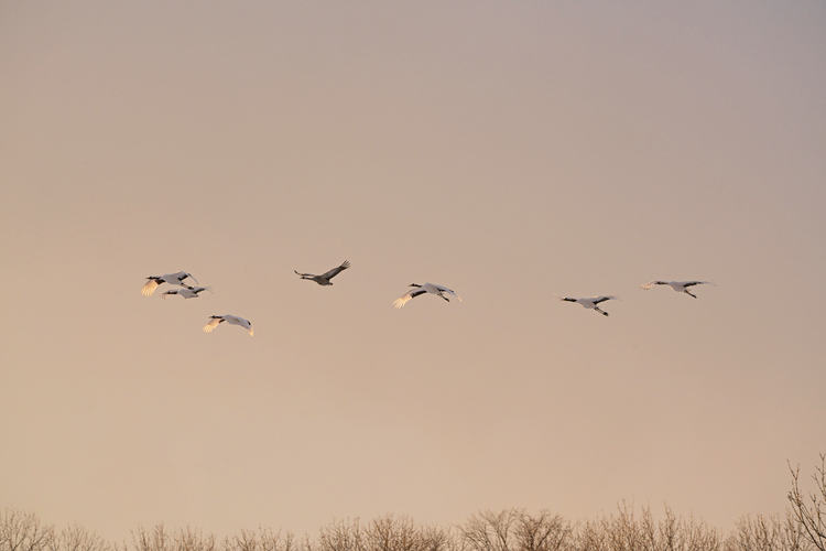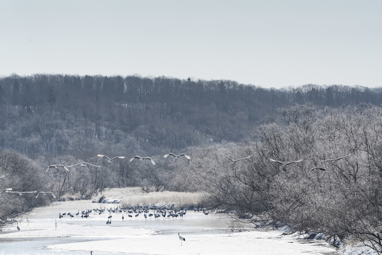 太陽が上がってくると、タンチョウは寝床から餌を求めて飛び立ち始めます。飛び立つところまで撮影し、その後に鶴居・伊藤タンチョウサンクチュアリに移動して撮影すると効率よく撮影ができます。