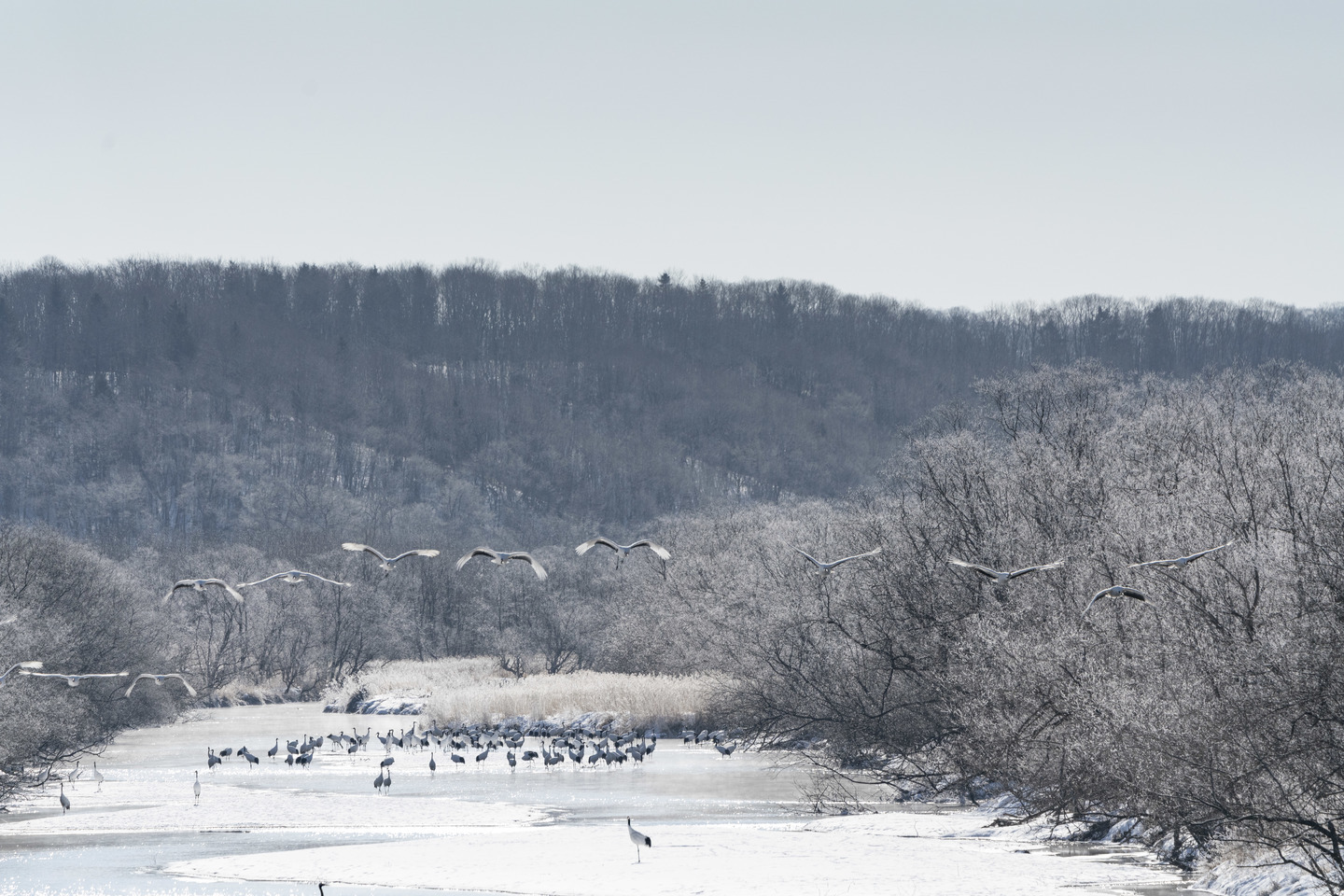 広大な北海道で、タンチョウをはじめ野生動物を撮影するには望遠レンズは必需品です。できれば、フルサイズ換算で600mmぐらいまでは欲しいところです。とても寒い中での移動もあり、そんな環境でレンズ交換もなかなか難しくなってきます。150-600mmや100-400mmなどの望遠ズームレンズを使用してレンズを交換しなくても撮影をこなせるようにしておくのがベストな選択です。それから寒さ対策、防水対策を忘れないように!