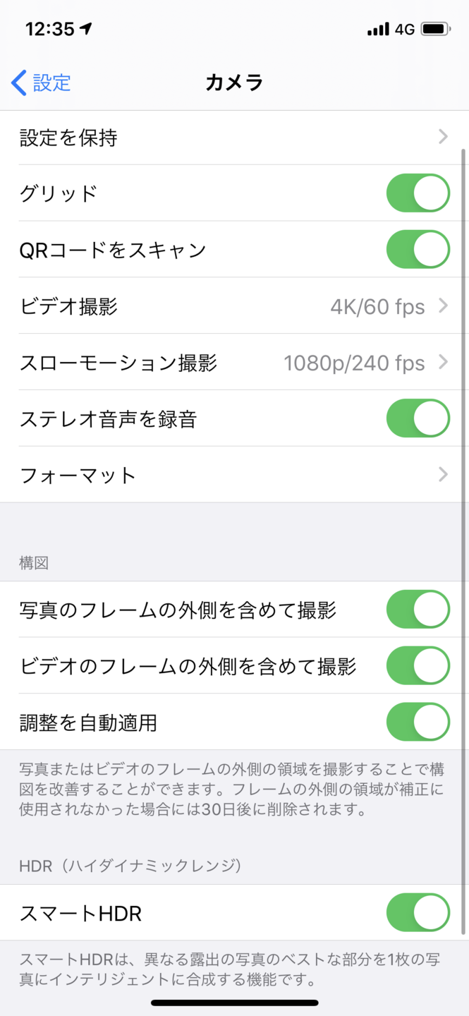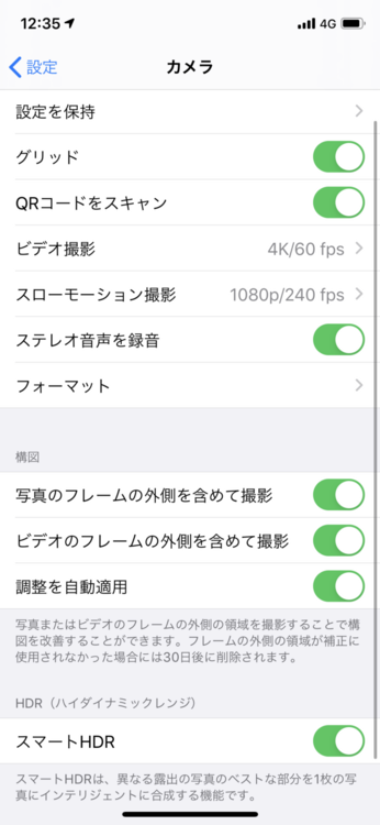 iPhone 11 Proの場合は、iPhoneの「設定」→「カメラ」→「グリッド」と辿ってオンにしましょう。
