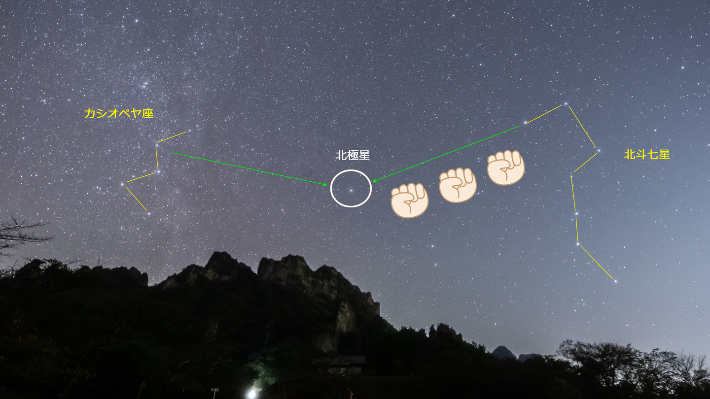 北極星の見つけ方は上の画像のように、北斗七星・カシオペヤ座からたどると良いと思います。それぞれの星座から「こぶし3個分」離れたところにあるのが北極星です。最初はコンパスなどを使って北の方角を調べてみましょう。また、季節によって星座の位置は変わるので注意してください。