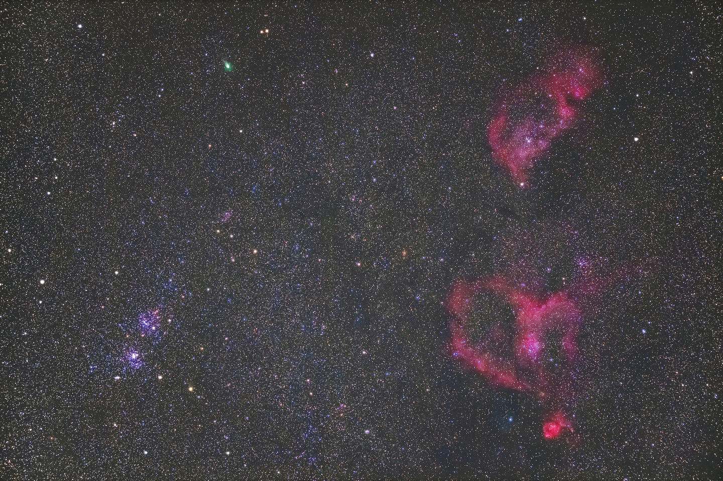 焦点距離200mm程度のレンズで撮影した天体写真。二重星団h-χ(左下)、胎児星雲(右上)、ハート星雲(右下)、パンスターズ彗星(左上のちょこっと緑の星)を撮影(2020年1月16日撮影)。パンスターズ彗星は3月までこの領域で撮影することができる。