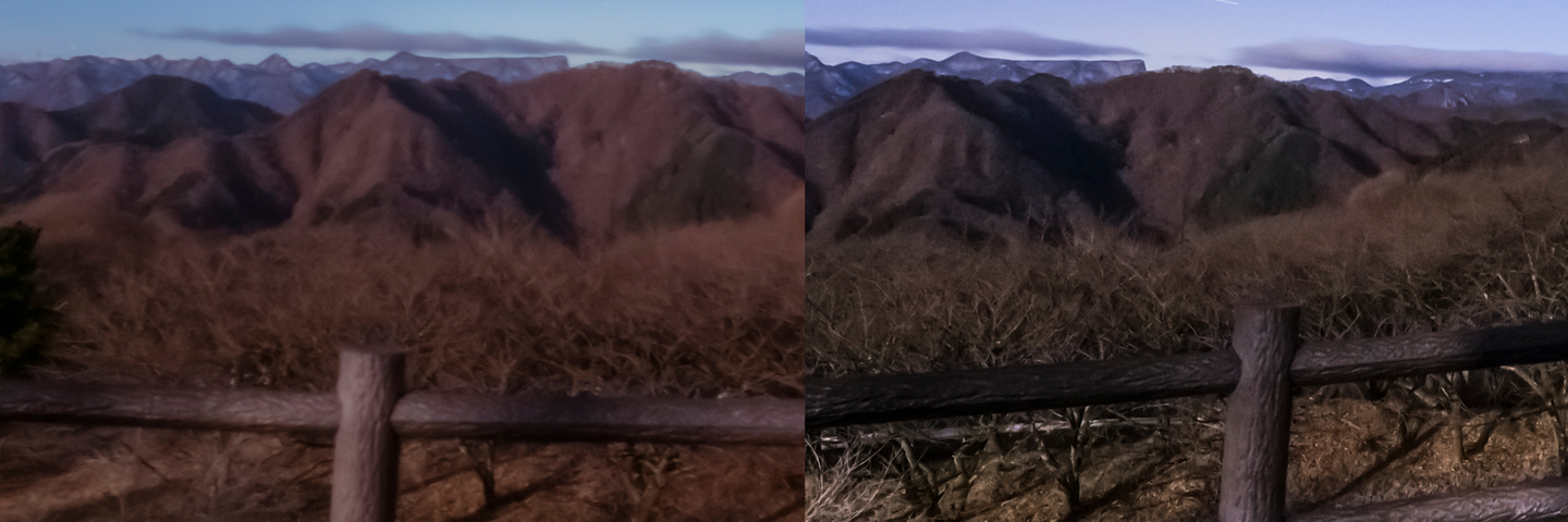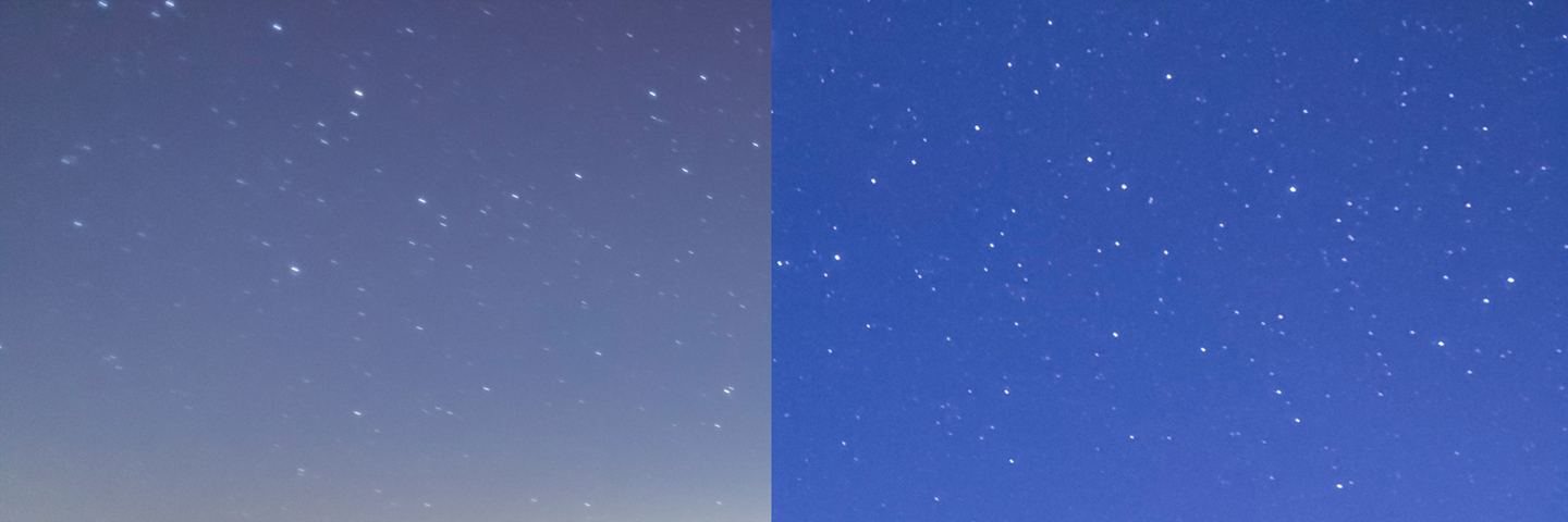 星空の部分を拡大してみましょう。同じく左はSMSなし、右はポラリエUでSMSあり。最も動きの少ない北側の星を拡大。左の画像は回転方向に星が流れているのに対し、右の画像は星を点で写すことができた。星の流れ方は、撮影する方角によっても変わってくるが、SMS機能によって近景・遠景の双方にこのような差が出る。