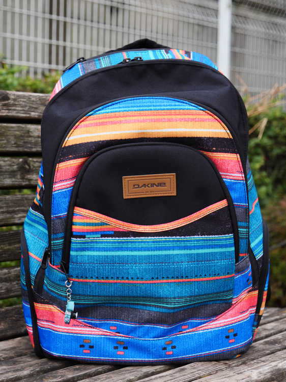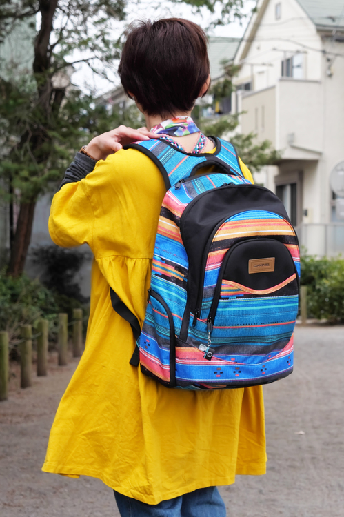 バッグの形状は、両手が自由になるリュック型の出番が一番多く、カラフルなデザインが好みです。最近よく使っているこのリュックは、沖縄に行ったときに何気なく立ち寄ったアウトドア系のお店で一目惚れした物で、軽い、大きい、肩のストラップが幅広い、ポケットが沢山ある、ちょっとの雨には負けない防水加工と、私がカメラバッグに求める5つのポイントをクリアーしている製品で、旅先の浮かれ気分も手伝って即決購入しました。