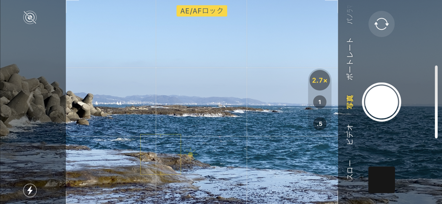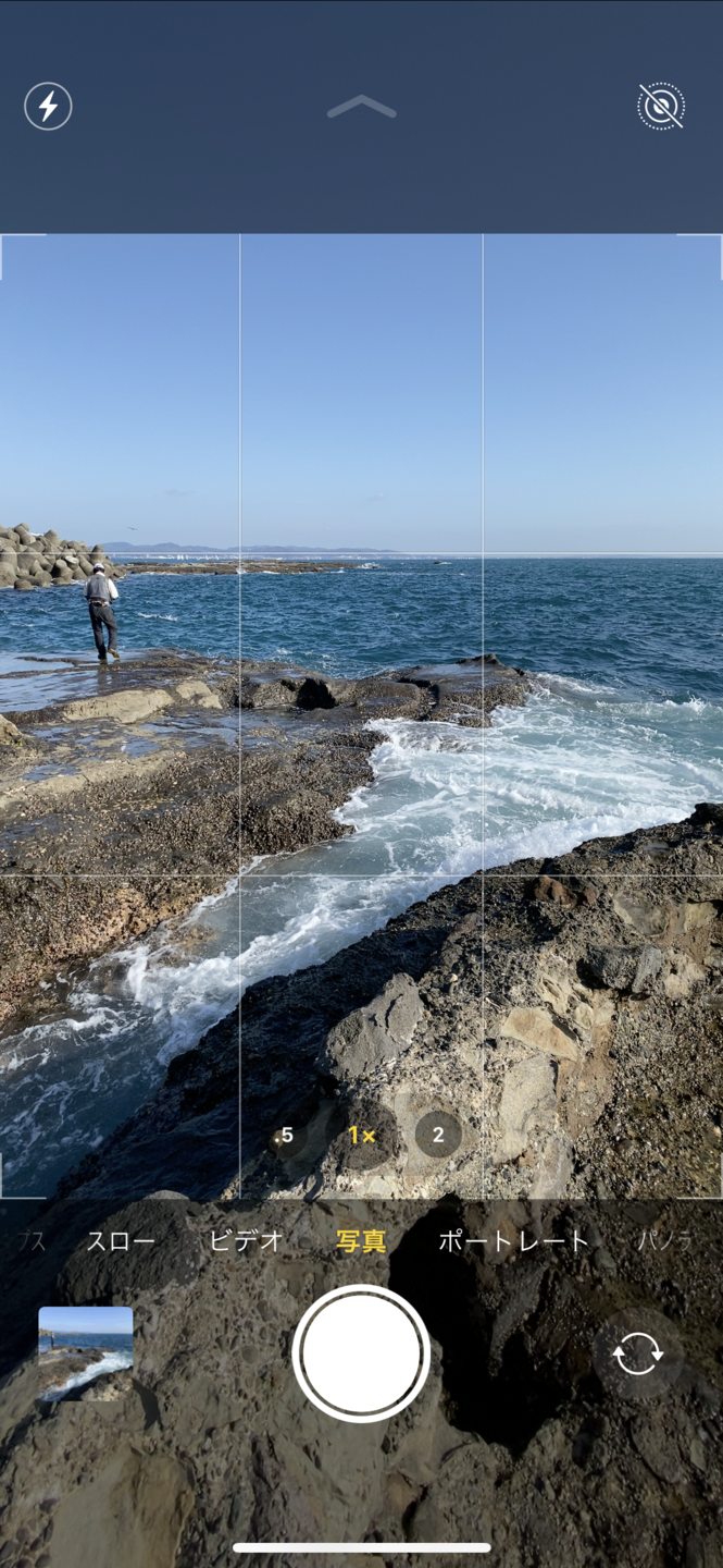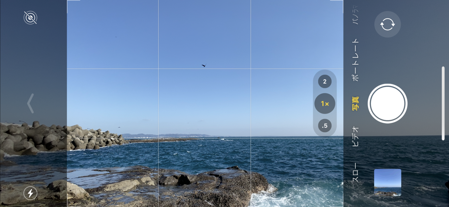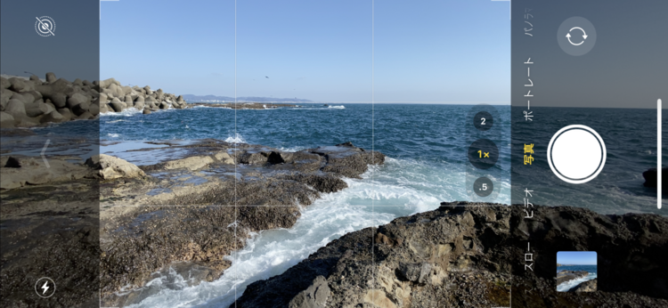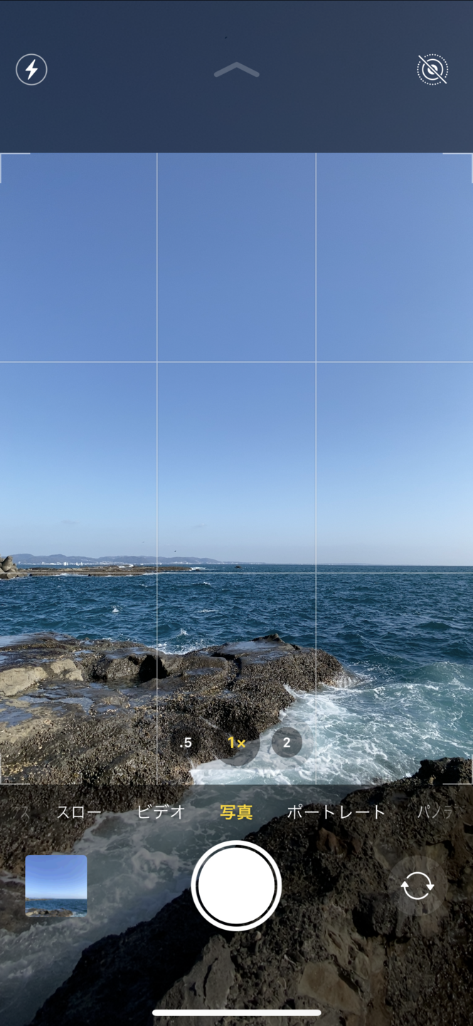 江ノ島でのカットのスクリーンショットですが、まずは上のグリッド線、次は下のグリッド線というように水平線を合わせてシャッターを切りました。こうするだけで微妙な構図にならず、締まったカットになるのでオススメです。また、スマホを縦位置に構え直して、同様にグリッド線に合わせたカットを撮影するのもアリです。